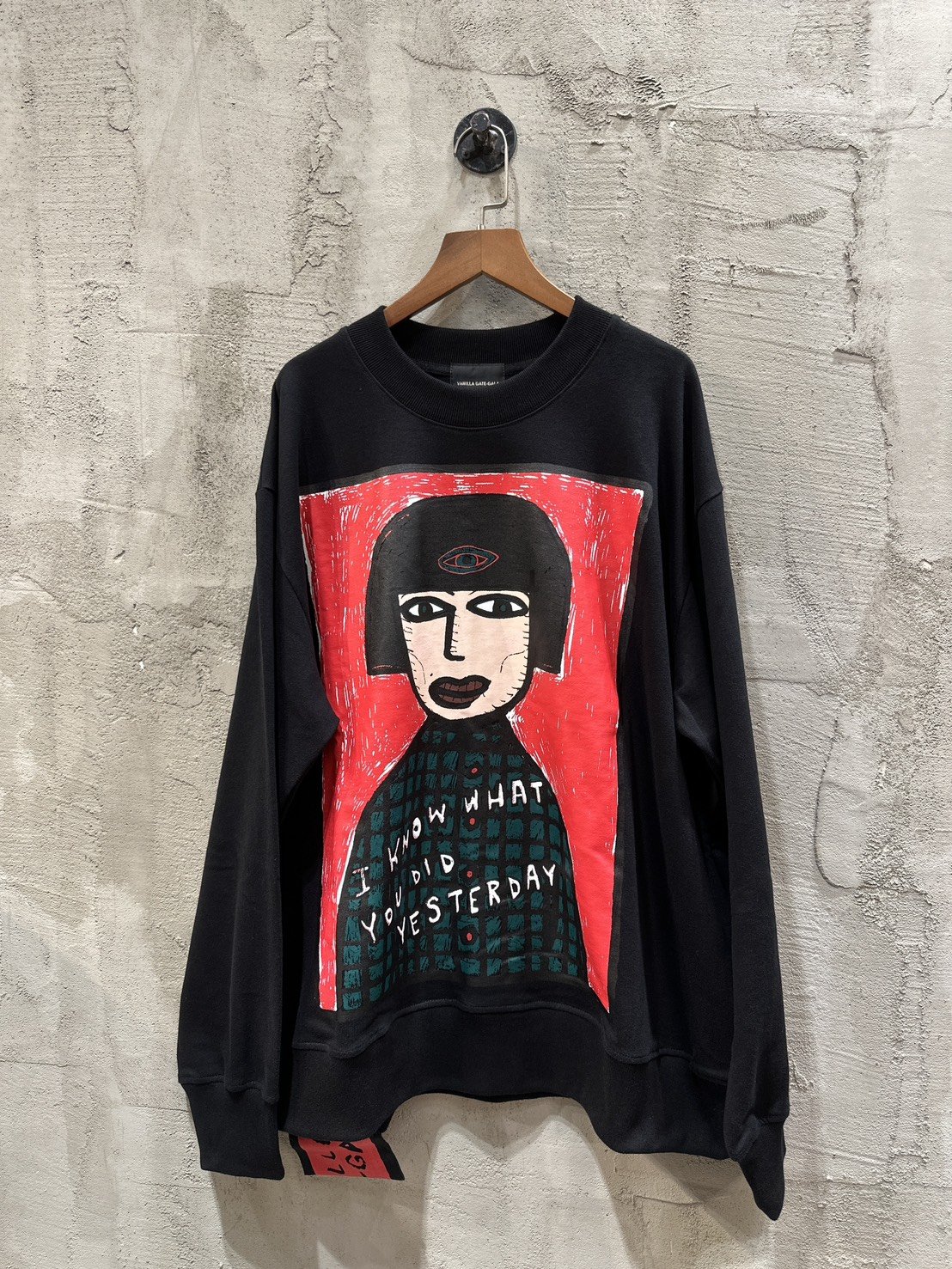 Loose fit sweater with bold hand-printed artwork. A structured silhouette softened by stillness. This top carries the original hand-drawn artwork—transformed into wearable art through silkscreen printing on soft terry cotton.