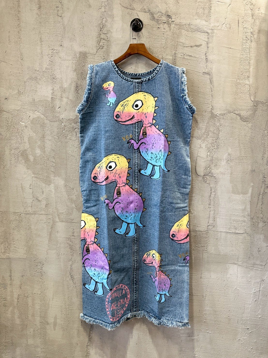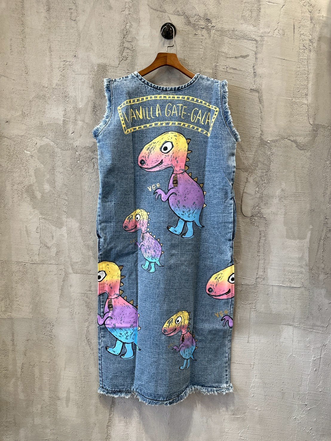 Crafted in a chic loose silhouette from soft bleached denim, the dress has a casual finished with a feminine round neck, midi straight cut for a sporty feel. A colorful Dino paint adds a playful signature to the look.