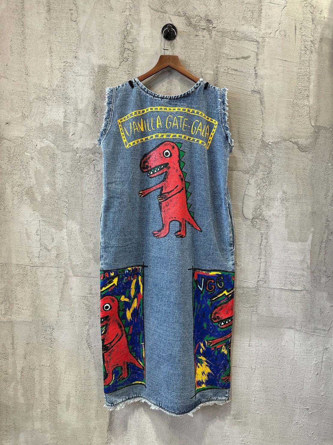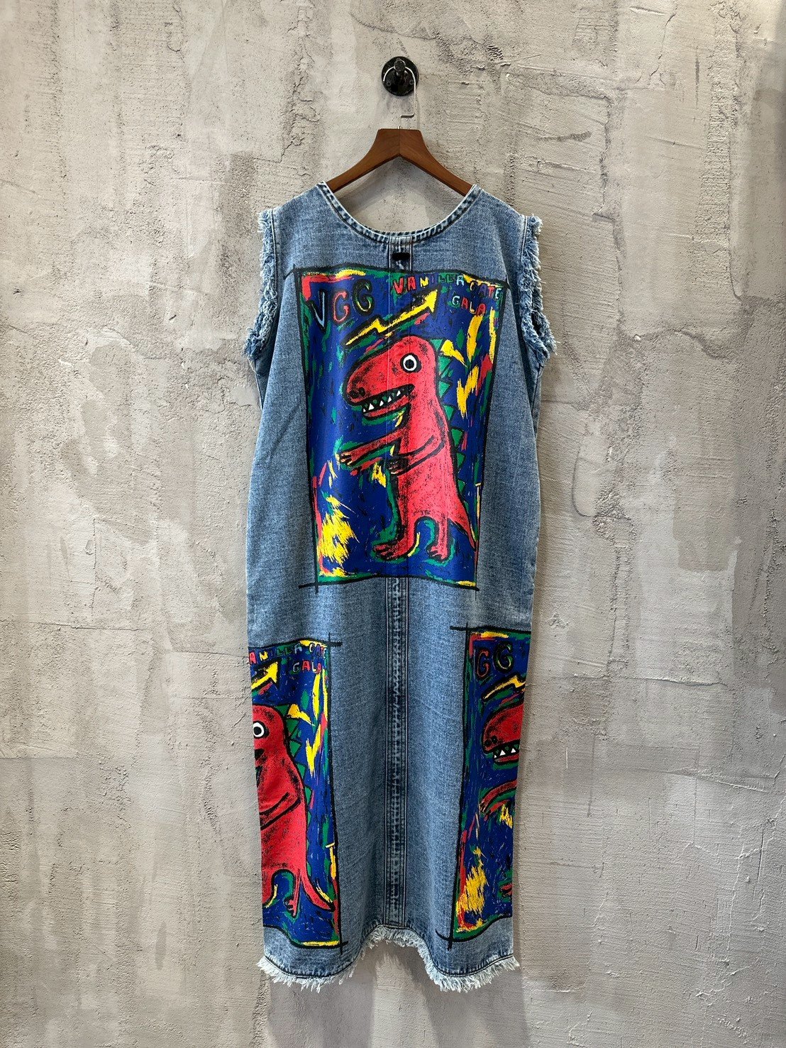 Crafted in a chic loose silhouette from soft bleached denim, the dress has a casual finished with a feminine round neck, midi straight cut for a sporty feel. A colorful Dino paint adds a playful signature to the look.