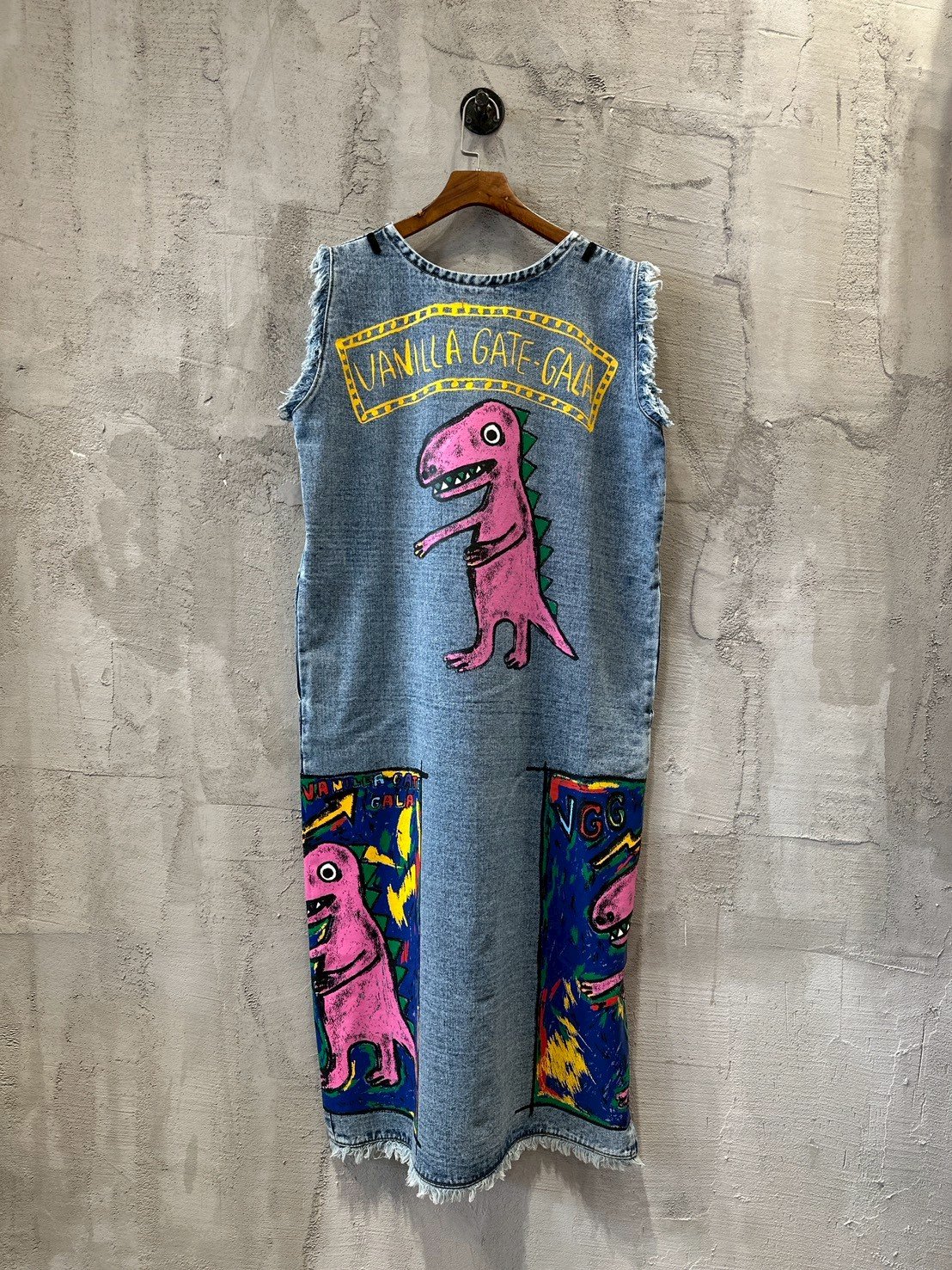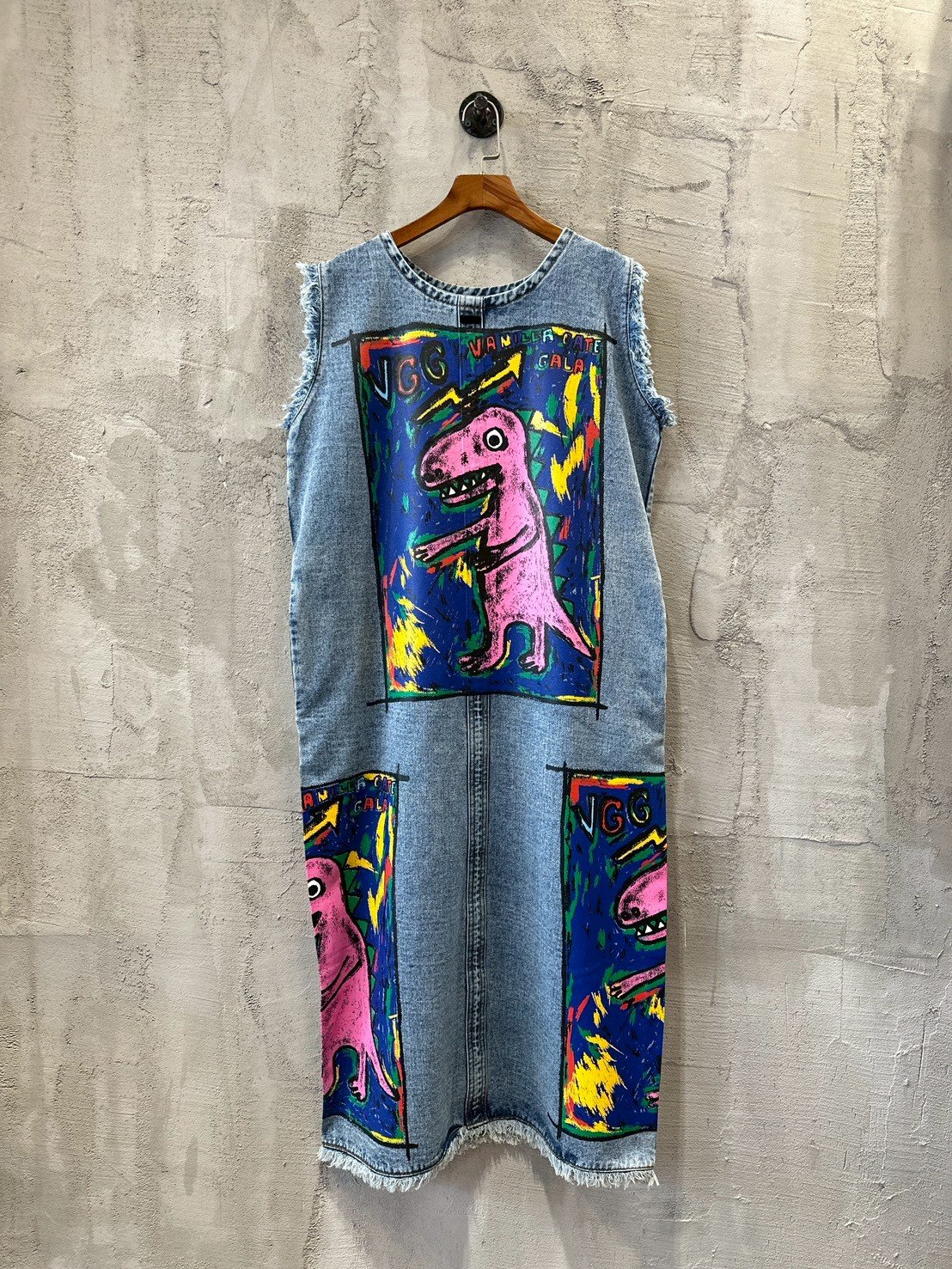 Crafted in a chic loose silhouette from soft bleached denim, the dress has a casual finished with a feminine round neck, midi straight cut for a sporty feel. A colorful Dino paint adds a playful signature to the look.